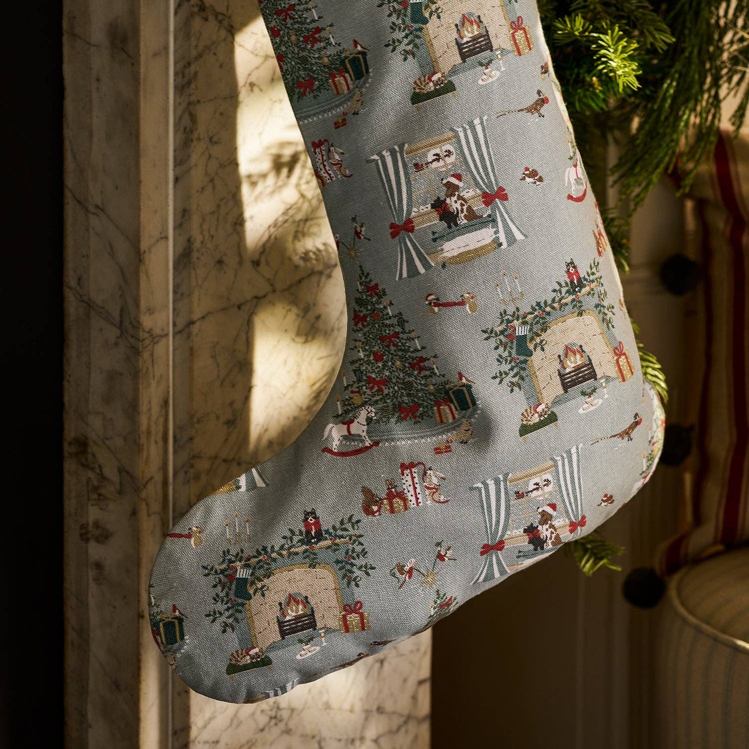 Hang this Cosy Christmas Stocking by the fireplace and let the festive traditions begin. Adorned with a detailed cosy scene, complete with dogs in the window, a roaring fireplace, and a festive tree, it’s made from 100% cotton with decorative pompoms. It’s a classic piece to bring out each December.