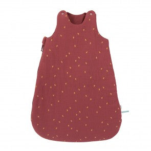 0-6 months sleeping bag (TOG 3) made from natural materials: terracotta muslin with oak leaves design on the outside, and 100% cotton woven fabric lining to allow baby's skin to breathe. Zip and press-stud fastening for easy dressing.