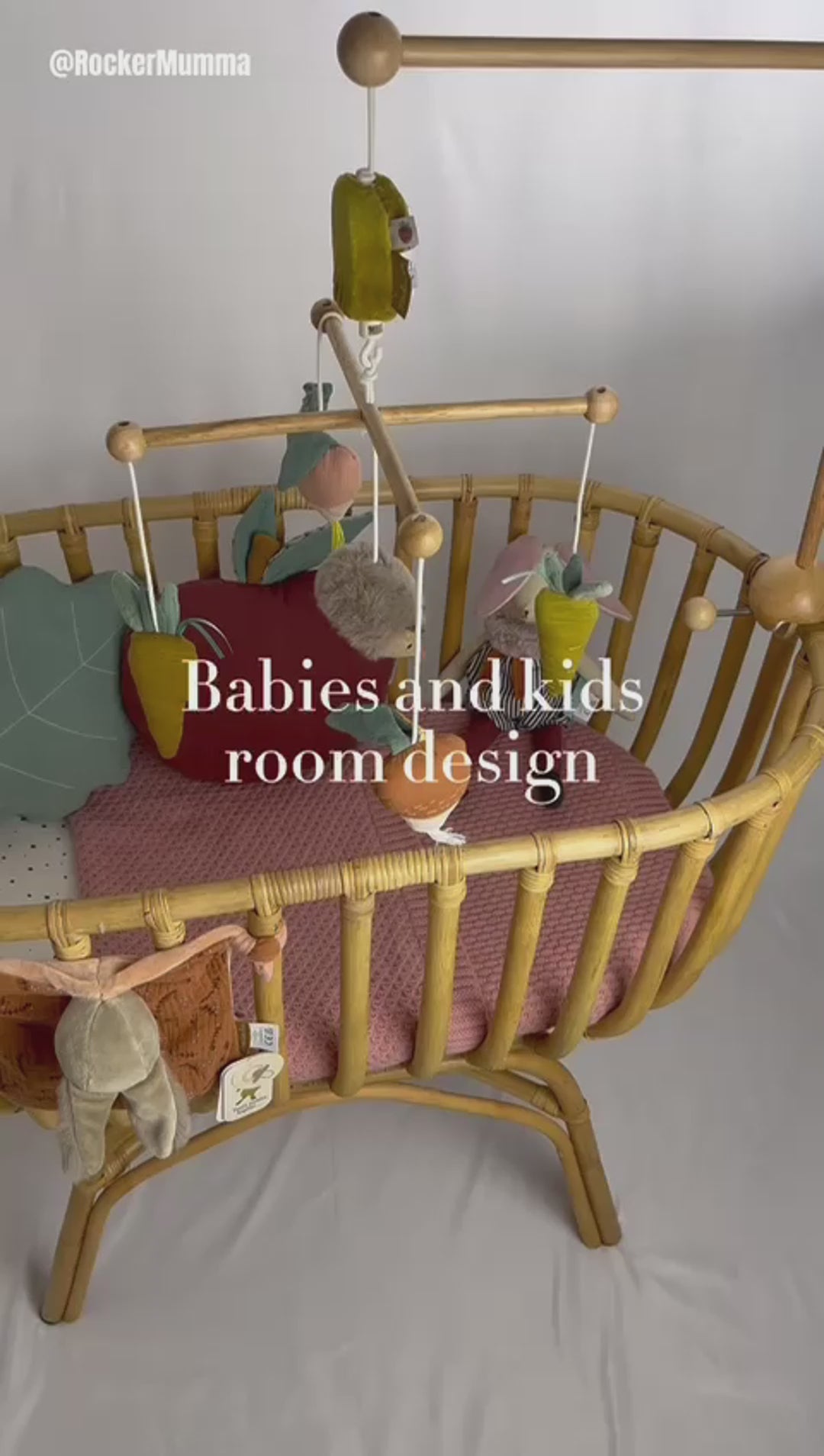 Musical mobile in soft colours for stimulating baby's sight and hearing, gently sending them off to sleep. A little hedgehog dances on a wooden structure amongst the vegetables in the garden - carrots and radishes - before drifting away to the land of nod.