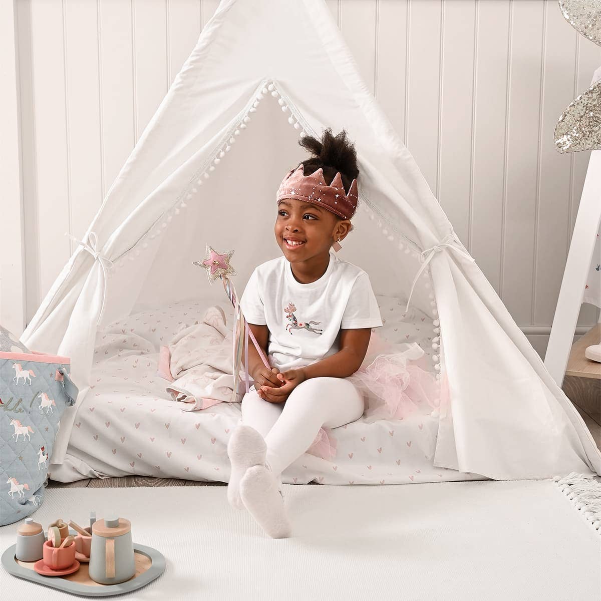This lovely quilted storage basket is perfect for storing their toys or even using as a kids laundry basket. The pretty design features radiant unicorns trotting gracefully across a chalky blue coloured background, surrounded by shimmering golden stars. Available in three sizes and features the words 'Sparkle!' embroidered in Sophie's signature handwriting. Perfect for keeping their room tidy and organised. * Available in three sizes * Small: 20 x 22cm with 11cm handle * Medium: 28 x 32cm with 11cm handle * Large: 40 x 42cm with 11cm handle * 'Sparkle!' embroidered on the front * Made from 100% cotton with polyester padding * Part of the Unicorn Collection Care Guide Do not wash. Remove spots with a damp cloth.