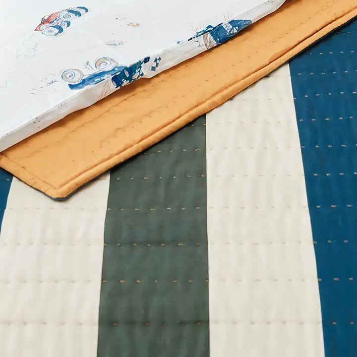Our Vehicles collection features monster trucks, motorbikes and racing cars. Our Vehicles quilt features our colour blocked abstract racing flag in muted bright hues for a modern, contemporary style. Made from 100% certified organic cotton with a top stitching finish for an extra special touch. Our handmade quilts are a perfect to use as a decorative centre piece for your child's nursery, as well as a natural bedspread for when your child is ready to progress to a bed. * For cot bed size = 100x120cm * For single bed size = 170x220cm * For double bed size = 220x225cm * Vehicles quilt features abstract racing flag in muted bright hues * Outer: 100% organic cotton; Filling: 100% organic cotton * Machine wash cold